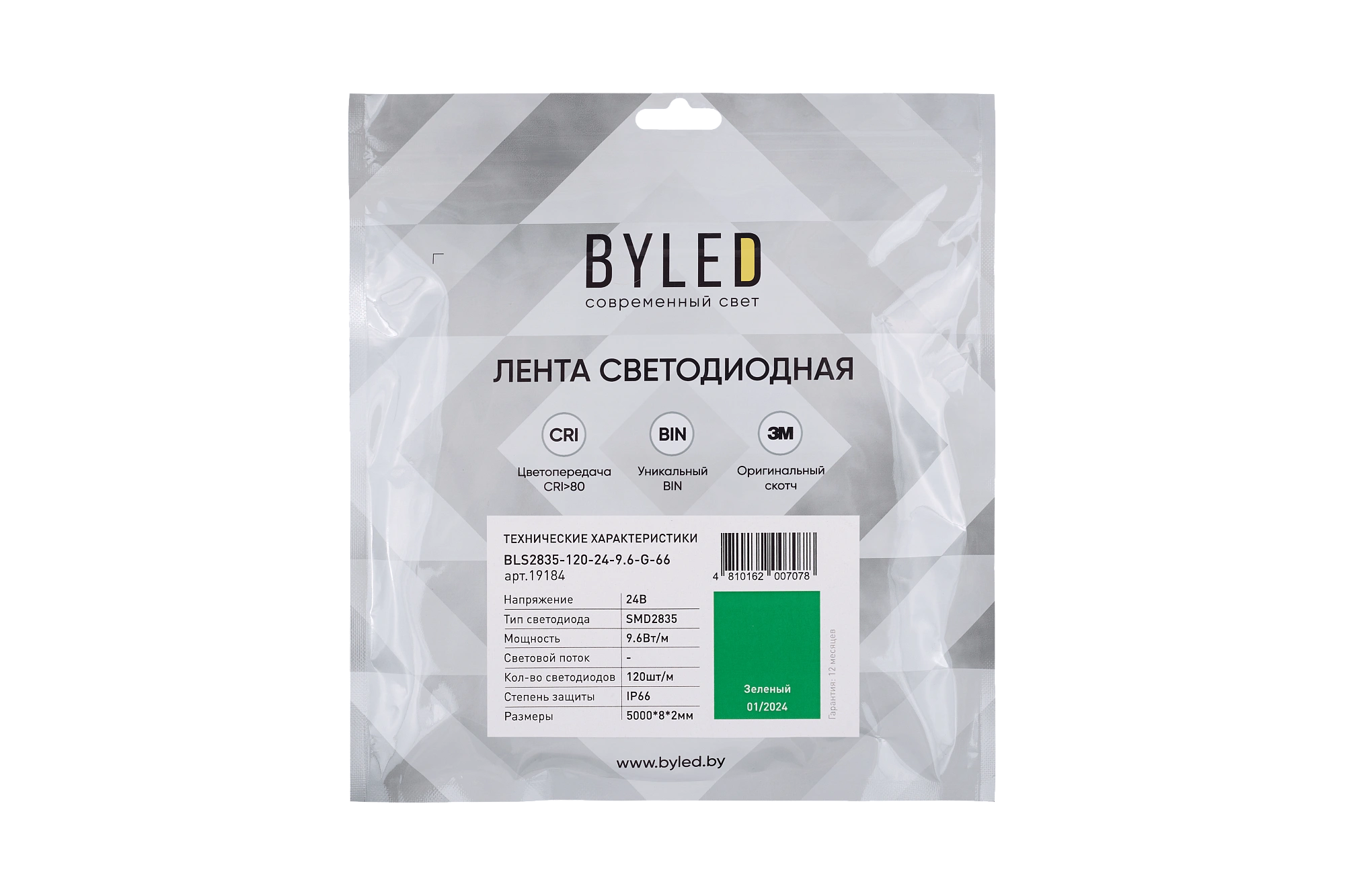 Лента светодиодная Byled Standart 2835, 120 LED/м, 9,6 Вт/м, 24V , IP66, Цвет: Зеленый
