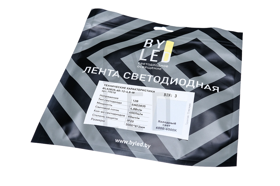 Лента светодиодная Byled Standart 2835, 60 LED/м, 4.8 Вт/м, 12В , IP20, Цвет: Холодный белый