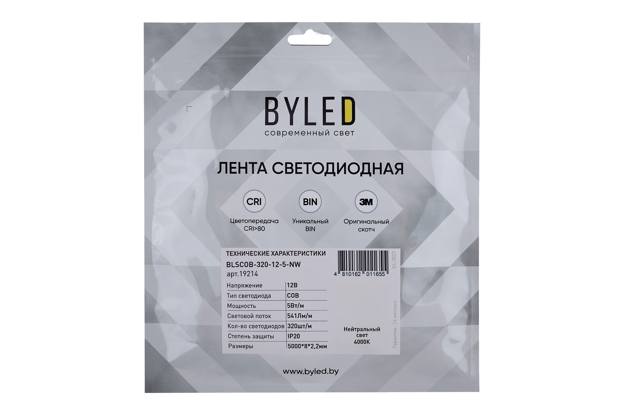 Светодиодная лента Byled Standart COB CSP Led, 320 LED/m, 5W/m, 12V , IP20, 24мес., Цвет: Нейтральный белый 4000K